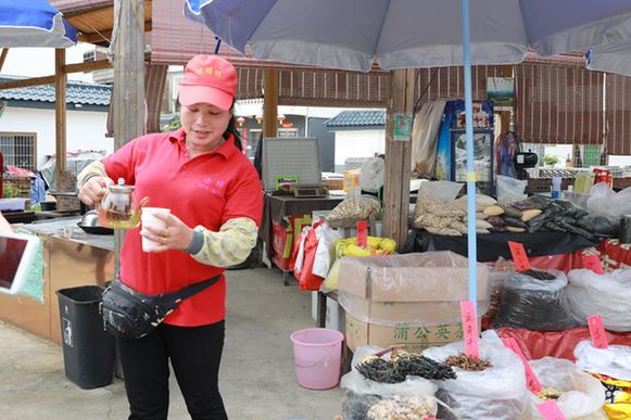 “天太熱,來喝口我這免費的茶?!辈湃脒B樟村村口,記者便被熱情的村民陸秀媚招呼到了自己的攤位。紅茶、本地枝葉、山柑皮、筍干……她的攤位琳瑯滿目,擺得滿滿當當。陸秀媚告訴記者,自己曾經(jīng)在市里賣童裝,剛開始還能掙到些錢,后來隨著網(wǎng)購興起,實體店的生意越來越難做。2018年,在習近平總書記來連樟村視察后,看到家鄉(xiāng)越變越好,陸秀媚選擇了回到村里創(chuàng)業(yè)。