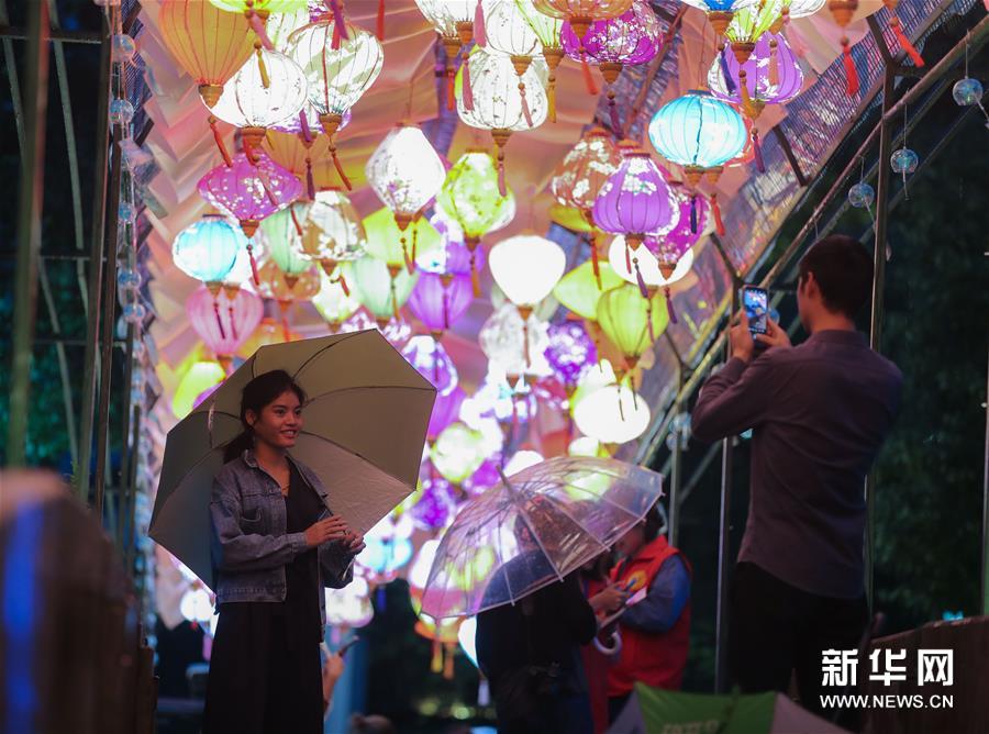 9月29日,游客在龍門古鎮(zhèn)內(nèi)觀賞廟會(huì)花燈。 新華社記者 徐昱 攝
