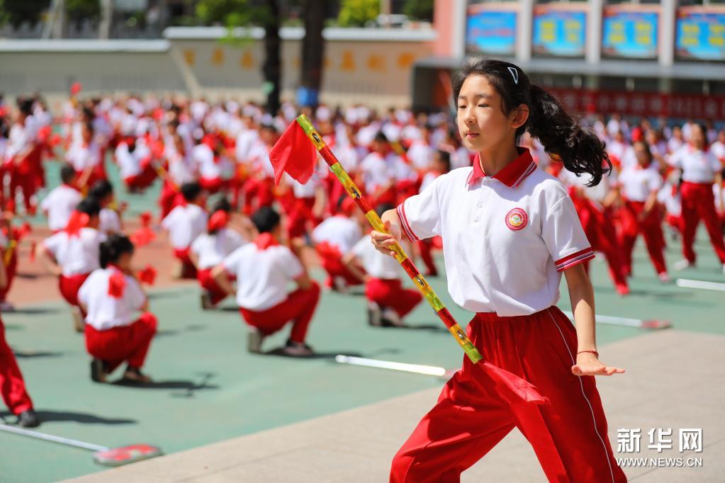 6月10日,在承德市雙橋區(qū)南營(yíng)子小學(xué),學(xué)生在大課間上練習(xí)“霸王鞭”。近年來(lái),河北省承德市雙橋區(qū)南營(yíng)子小學(xué)以開展“陽(yáng)光大課間”為平臺(tái),將非遺民間舞蹈“霸王鞭”融入學(xué)校素質(zhì)教育實(shí)踐中,通過(guò)聘任專業(yè)老師,開設(shè)“霸王鞭”體育運(yùn)動(dòng)社團(tuán),引導(dǎo)小學(xué)生在大課間上練習(xí)“霸王鞭”,增強(qiáng)體質(zhì),傳承非遺。新華社發(fā)(劉環(huán)宇 攝)