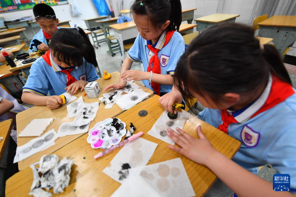 5月15日,在長沙市天心區(qū)紅衛(wèi)小學,學生在拓印課上體驗拓印制作。