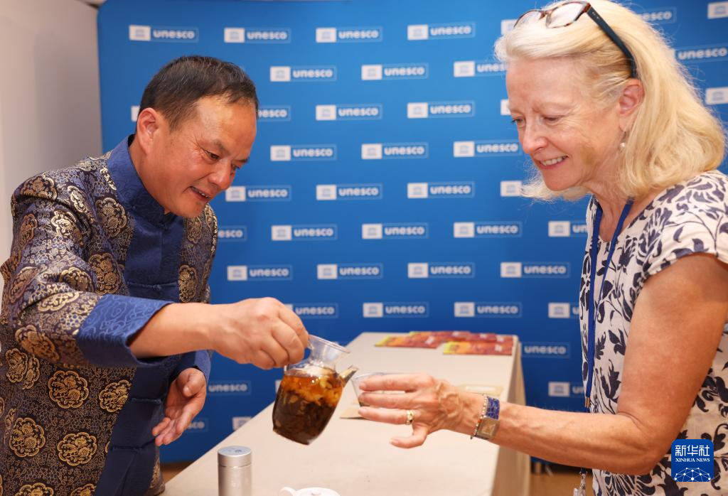 7月11日,在位于法國巴黎的聯(lián)合國教科文組織總部,嘉賓品嘗南京雨花茶。新華社記者 高靜 攝