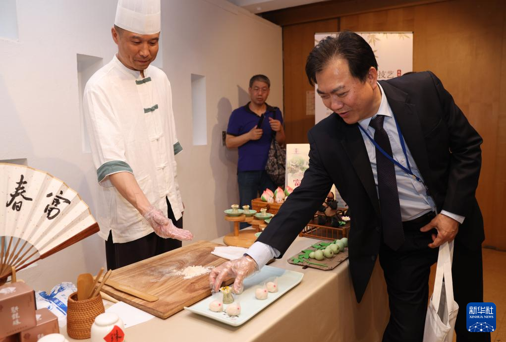7月11日,在位于法國巴黎的聯(lián)合國教科文組織總部,南京雨花茶傳承人陳盛峰演示制作雨花茶。