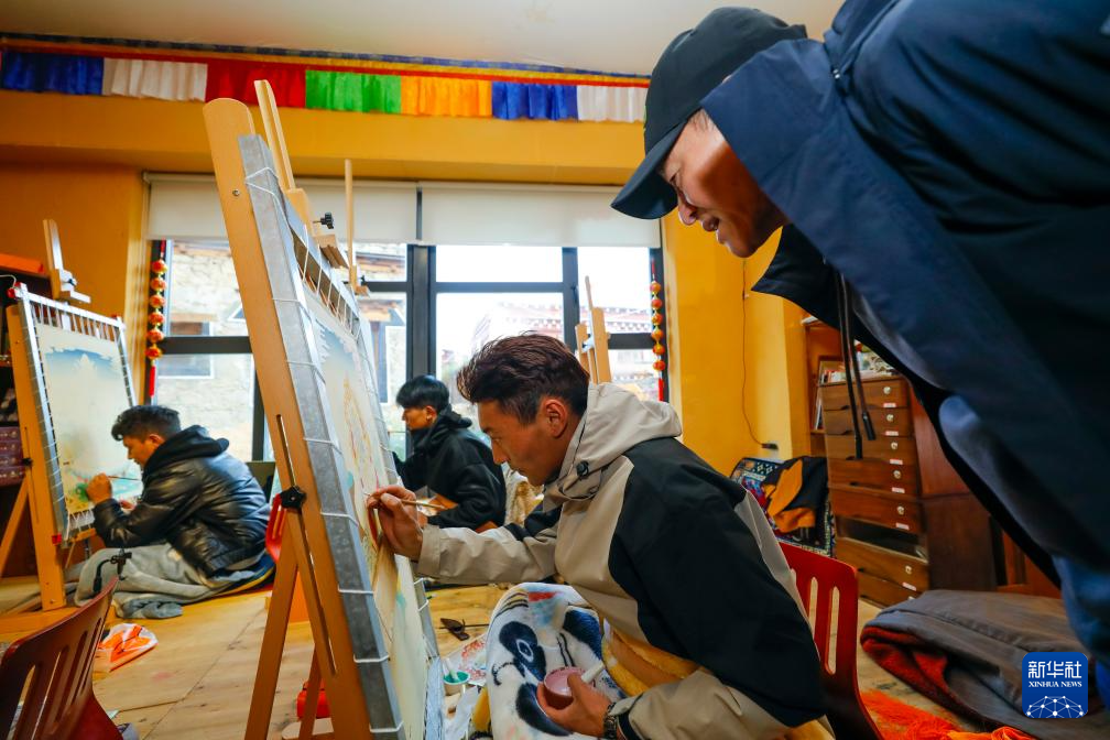 10月10日,游客(右)在理塘縣勒通古鎮(zhèn)的“唐卡館”觀看當?shù)厮囆g家創(chuàng)作唐卡作品。