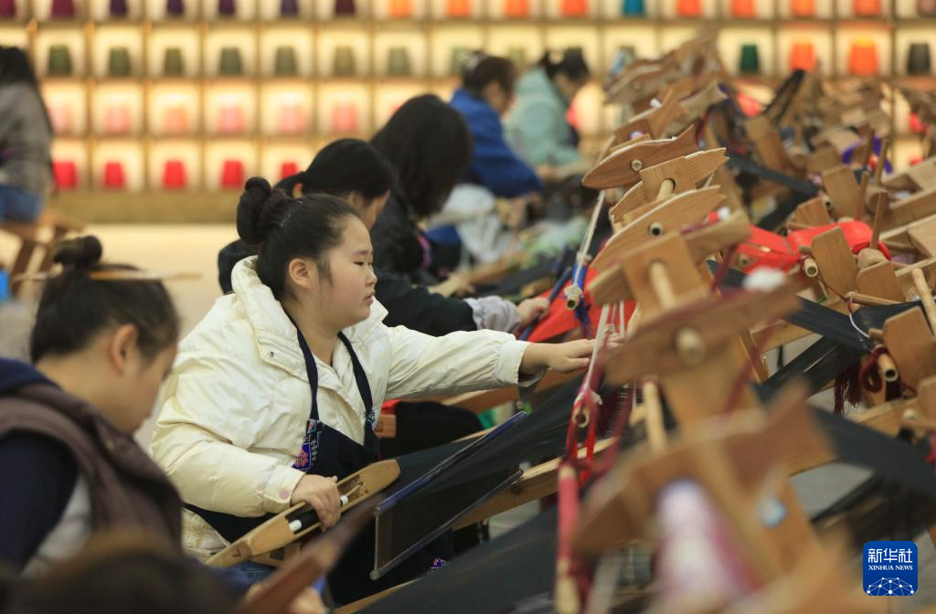 立冬過后,湖南省張家界市武陵源區(qū)非遺土家族織錦生產(chǎn)企業(yè)根據(jù)顧客訂單,制作圍巾、披肩、拖鞋、頭飾等冬季系列織錦產(chǎn)品,拓展線上線下銷售渠道,迎接冬天銷售旺季。新華社發(fā)(吳勇兵攝)