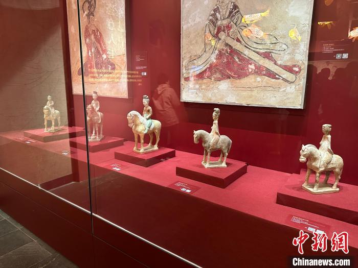 唐墓中的壁畫和彩色陶俑是唐代極具代表性的藝術(shù)珍品。記者在展廳看到,女性陶俑類型多樣,各種女坐俑、立俑、侍俑、樂舞俑、騎馬俑、貴婦俑……這些女俑造型生動,尤其是三彩女俑,釉色艷麗,呈現(xiàn)了唐代女性“千人千面”的生存狀態(tài)。