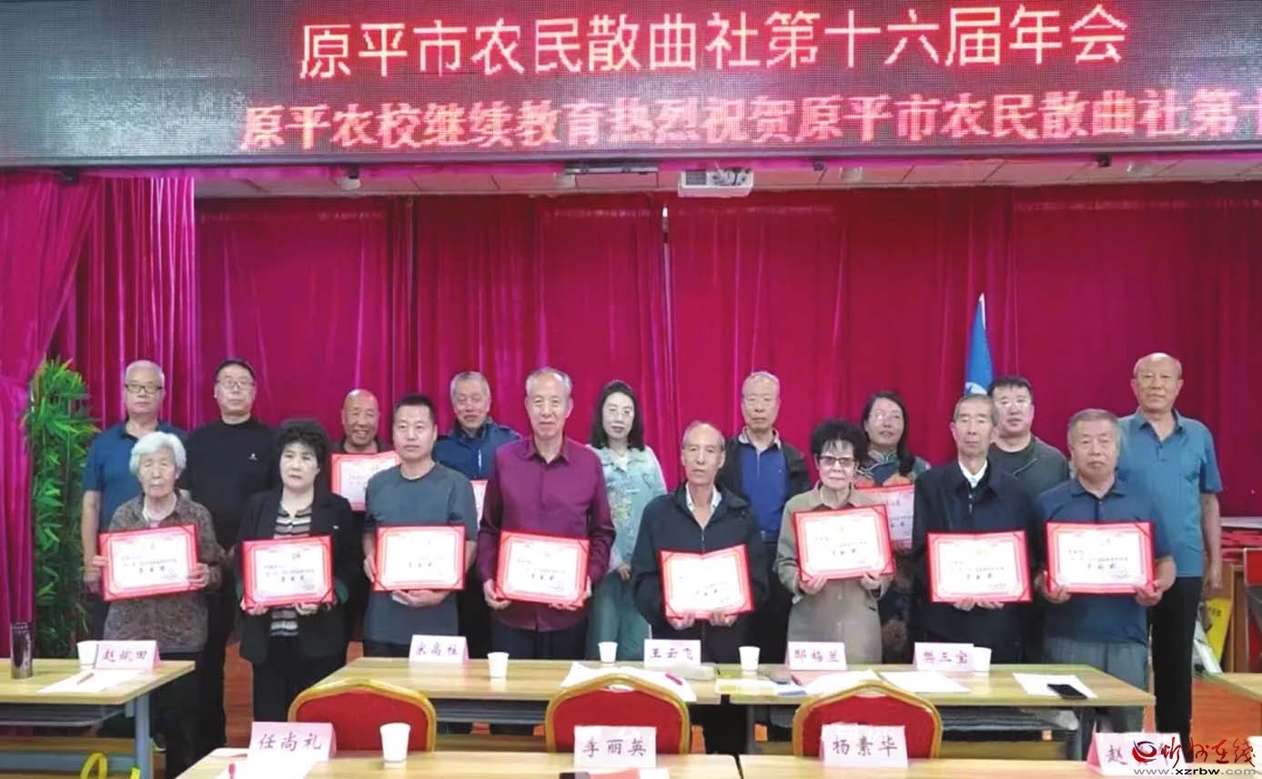 散曲社朗誦部的曲友們在悠揚音樂聲中,激情澎湃地朗誦著五谷飄香的農(nóng)民散曲,20多名優(yōu)秀社員受到表彰,展示出原平農(nóng)民散曲的喜慶豐收景象?!霸娙绯?,農(nóng)民種曲名聲在,情如火,南腔北調(diào)心澎湃。曲如海,同舟共濟(jì)承傳愛,暖如春,一年四季花不敗?;ㄩ_滿地鮮,曲韻熔天籟,好一個震驚曲界田園派?!边@首散曲《正宮·塞鴻秋》道出了散曲社社員們的心聲。