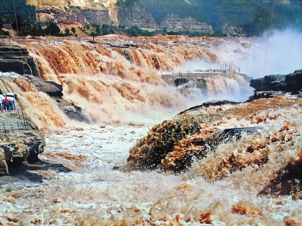 次日一大早,我獨自沿著黃河岸邊山西吉縣段向北行走,邊鍛煉身體邊觀瀑。黃河奔流至此,石壁峭立,河口收縮如壺口,故名。河面壓縮到二三十米,每秒一千立方米的河水,從二十多米高的陡崖上傾注而瀉,形成“千里黃河一壺收”的壯美景象。壺口瀑布是國家5A級風(fēng)景名勝區(qū),東瀕山西省吉縣壺口鎮(zhèn),西臨陜西省宜川縣壺口鎮(zhèn),為兩省共有的旅游景區(qū)。一瀑布連二省,同名同鎮(zhèn),秦晉之好,傳為佳話。