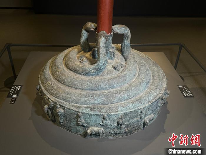 1月22日至3月2日,山西青銅博物館推出 “靈蛇獻(xiàn)瑞——乙巳蛇年生肖文物大聯(lián)展”。圖為戰(zhàn)國(guó)盤(pán)蛇鼓座。 中新社記者 楊靜 攝
