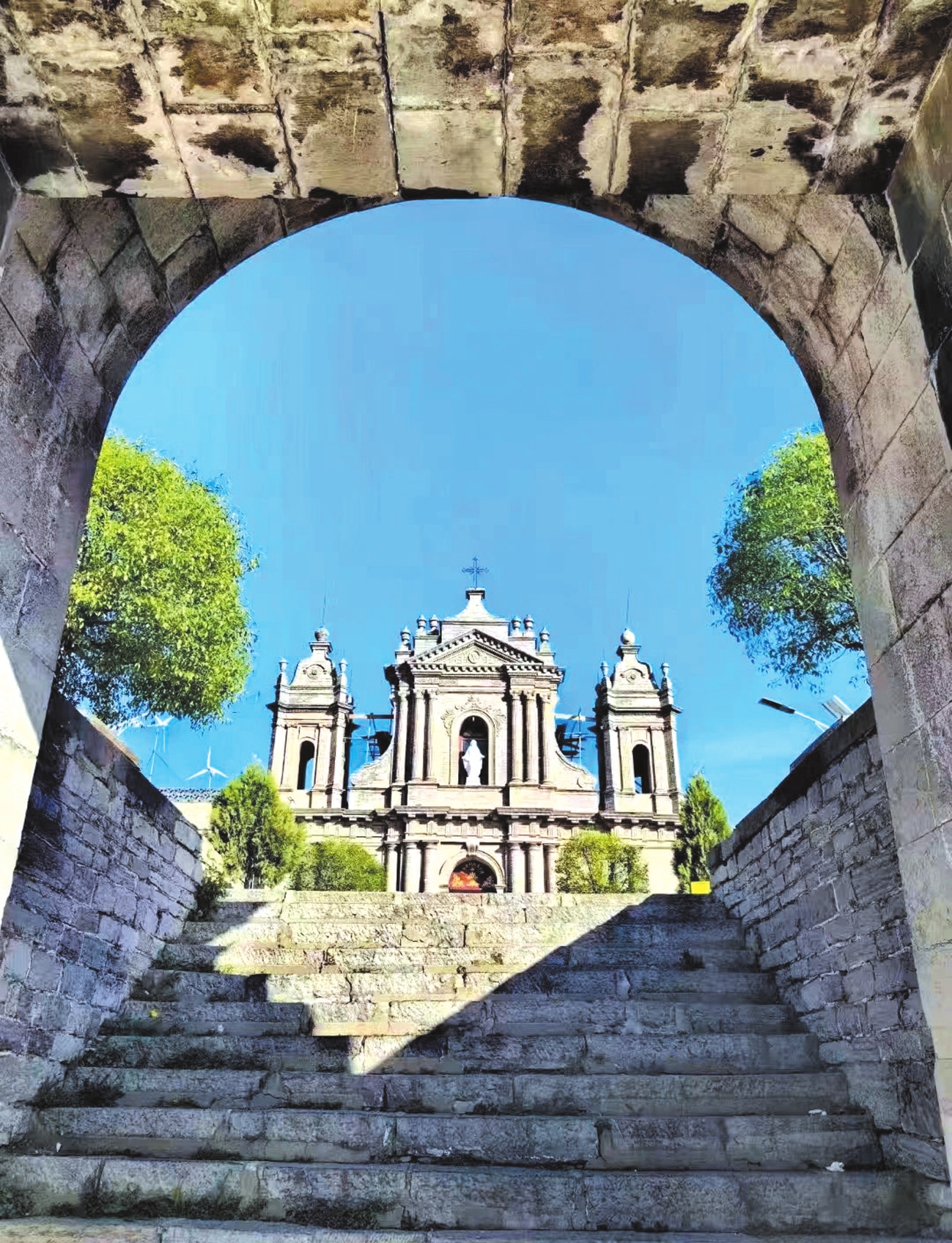 這座教堂始建于18世紀(jì)70年代,占地達三萬平方米。1897年—1898年間,意大利籍主教艾士杰與建筑師李有剛運用當(dāng)?shù)仄胀ùu石,奇跡般建造出一座異國風(fēng)情的高山城堡。教堂主體建筑簡練垂直,頂部裝飾方圓相間,數(shù)不清的十字架直指云天。內(nèi)部則完全是西式的雕像、壁畫和教務(wù)活動,讓人恍如置身歐洲。