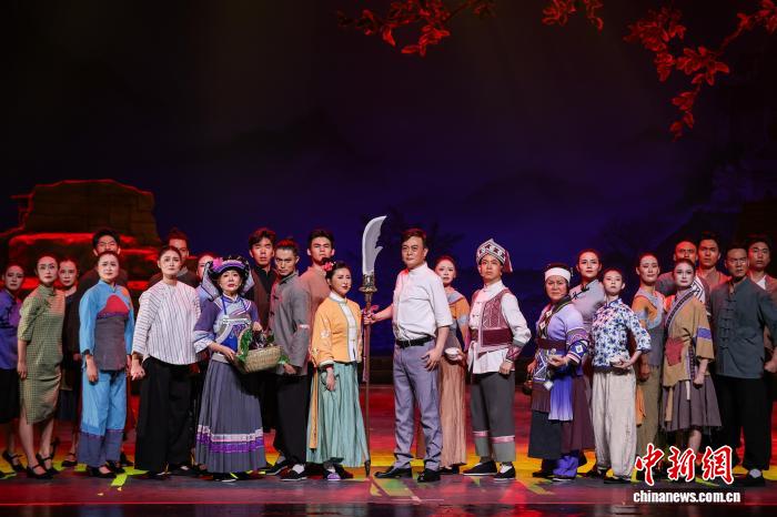 圖為演出現(xiàn)場。 記者 瞿宏倫 攝 《山河同心》將屯堡地戲、苗族歌舞、布依族音樂等傳統(tǒng)藝術(shù)形式與現(xiàn)代舞臺(tái)表現(xiàn)手法有機(jī)融合,通過歌舞的形式,講述抗日戰(zhàn)爭時(shí)期,安順各族民眾紛紛送兒上前線的故事,集中呈現(xiàn)貴州的民族文化,展現(xiàn)貴州各族兒女在抗日戰(zhàn)爭中的家國情懷和民族大義。 角色“陳天龍”飾演者李家霖接受媒體采訪時(shí)說,“能參與這部劇很幸運(yùn),一流的劇本、音樂和導(dǎo)演團(tuán)隊(duì),都是十分難得的?!痹诶罴伊乜磥?,“陳天龍”是一座橋梁,詮釋出傳統(tǒng)藝人在民族危亡時(shí)刻的堅(jiān)守與轉(zhuǎn)變。