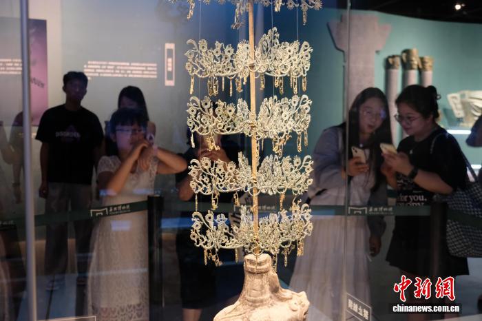 8月2日,游客在浙江寧波觀看三臺(tái)縣博物館藏“馬猴搖錢樹樹身”。 林波 攝