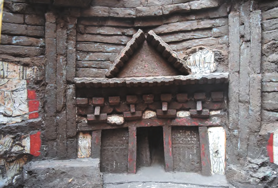 該墓葬為仿木構(gòu)磚雕壁畫墓,墓葬坐北朝南,由墓道、甬道和墓室三部分組成。墓葬裝飾采用磚雕和彩繪相結(jié)合手法。