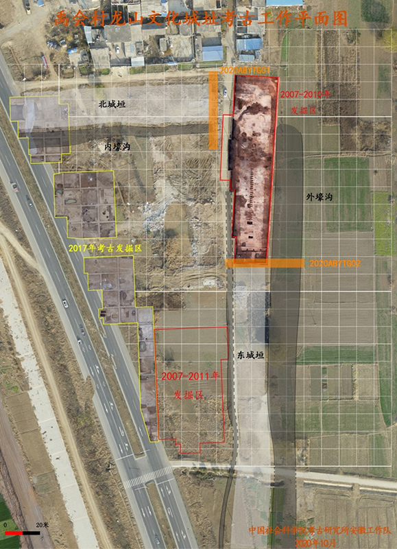 2020年禹會(huì)村龍山文化城址考古工作平面圖。匯報(bào)者供圖 安徽蚌埠禹會(huì)村遺址發(fā)現(xiàn)并確認(rèn)一座龍山文化城址,年代距今4400年至4100年,整體規(guī)模超過(guò)18萬(wàn)平方米?,F(xiàn)存東、北兩段城墻,長(zhǎng)300米至600米。城墻均堆筑而成,僅存城墻基礎(chǔ),寬18米至25米。