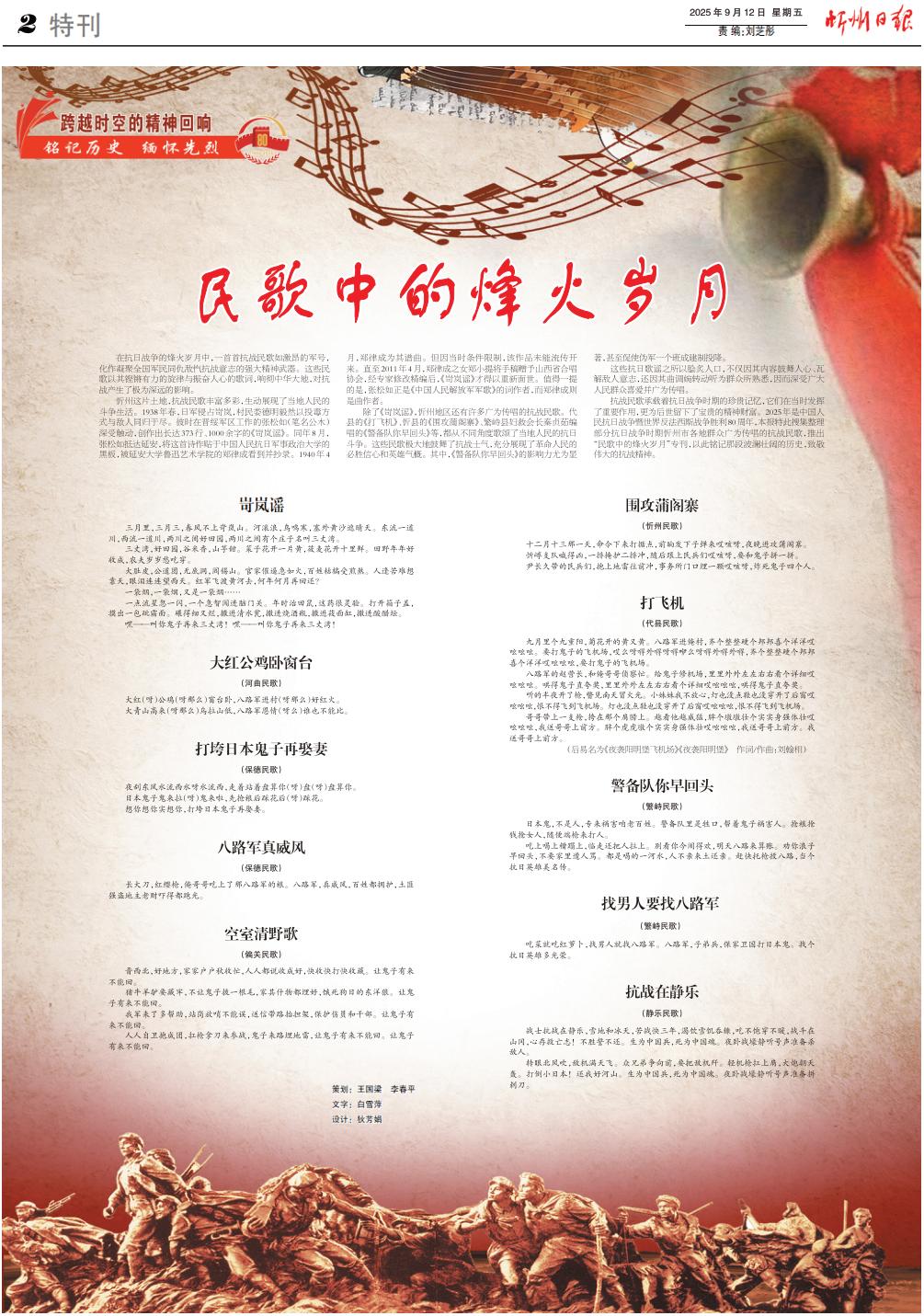 抗戰(zhàn)民歌承載著抗日戰(zhàn)爭時期的珍貴記憶,它們在當(dāng)時發(fā)揮了重要作用,更為后世留下了寶貴的精神財(cái)富。2025年是中國人民抗日戰(zhàn)爭暨世界反法西斯戰(zhàn)爭勝利80周年,本報(bào)特此搜集整理部分抗日戰(zhàn)爭時期忻州市各地群眾廣為傳唱的抗戰(zhàn)民歌,推出“民歌中的烽火歲月”???,以此銘記那段波瀾壯闊的歷史,致敬偉大的抗戰(zhàn)精神。