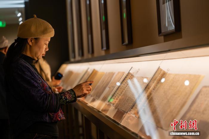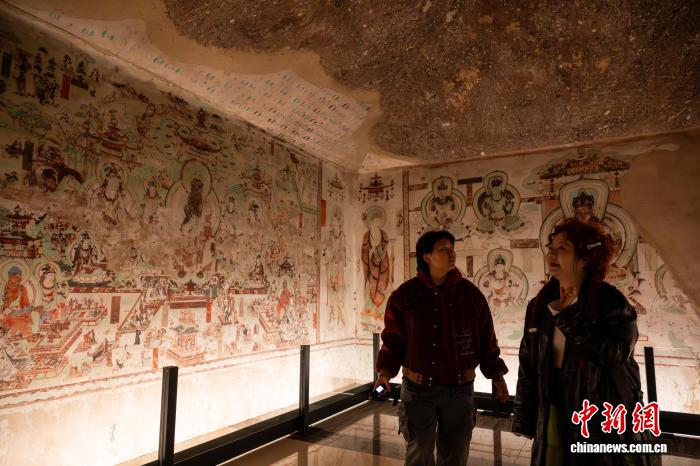11月11日,嘉賓在北京參觀“如是莫高”敦煌藝術(shù)大展第二季。據(jù)悉,展覽將于11月12日對(duì)公眾開放。(北京展覽館供圖) 本季展覽由敦煌研究院與北京展覽館集團(tuán)有限公司聯(lián)合主辦,深化“尋找藏經(jīng)洞”版塊內(nèi)容;增加敦煌復(fù)原服飾與復(fù)原樂器內(nèi)容,增強(qiáng)展品的多樣性與觀賞性。同時(shí),為觀眾提供內(nèi)容更多元、形式更豐富的藝術(shù)現(xiàn)場與學(xué)術(shù)活動(dòng),打造可融入、可感知的互動(dòng)觀展模式。 藏經(jīng)洞出土文物中既有文獻(xiàn),也有絹畫、法器等?!叭缡悄摺钡谝患尽笆邔毑亍眴卧?,不僅呈現(xiàn)了莫高窟第17窟原貌,還借助老照片等講述藏經(jīng)洞的百年歷史。第二季增加的文物復(fù)制展品中,既有中醫(yī)食療學(xué)專著《食療本草》,唐代重要的天文文物《紫微垣星圖》等珍貴文獻(xiàn),也有《樹下說法圖》《降魔成道圖》等繪畫藝術(shù)精品。