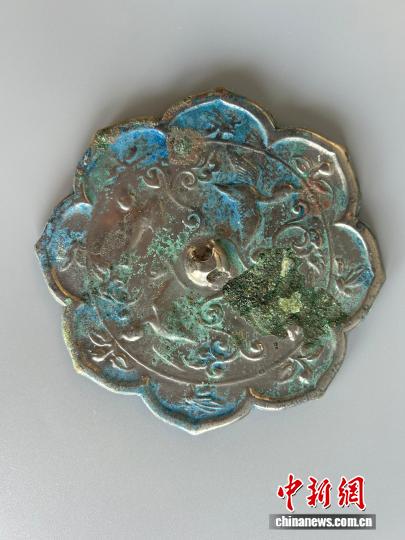 值得一提的是,在墓葬M7中出土的銅鏡十分精美。該銅鏡直徑11.2厘米,厚0.45厘米,鈕高0.4厘米,為八瓣菱花形,內(nèi)切圓形,圓鈕,鈕周邊飾鳥紋與花枝紋,緣內(nèi)蜜蜂、花葉相間排列。