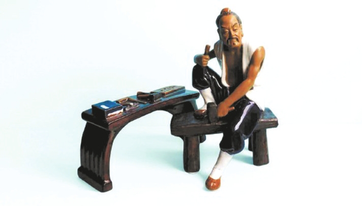 塑像高22厘米、長(zhǎng)14厘米、寬13厘米,魯班右手持鑿、左手緊握鐵錘,雙目炯炯,仿佛正凝神思索,即將開啟一場(chǎng)巧奪天工的創(chuàng)作;身旁的工作臺(tái)長(zhǎng)19.7厘米、寬6.5厘米、高10厘米,上面整齊擺放著曲尺、錘子、鑿子等工具。作品靈感源自春秋時(shí)期這位傳奇工匠的故事,以陶塑藝術(shù)為載體,栩栩如生地呈現(xiàn)出魯班的形象,讓歷史底蘊(yùn)與藝術(shù)魅力交融出獨(dú)特的韻味。