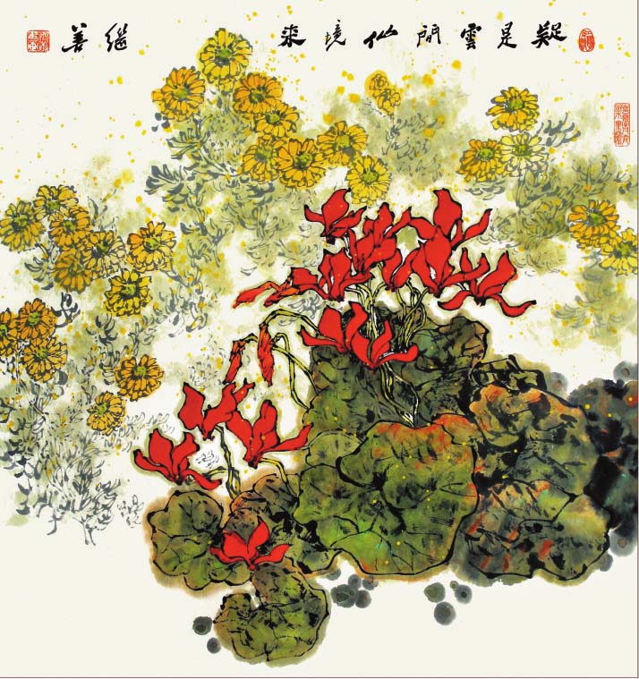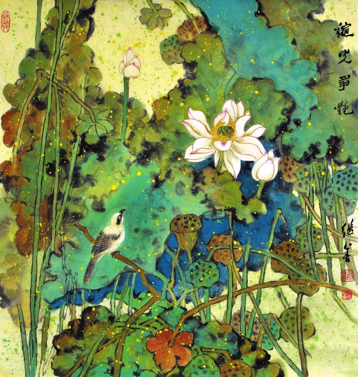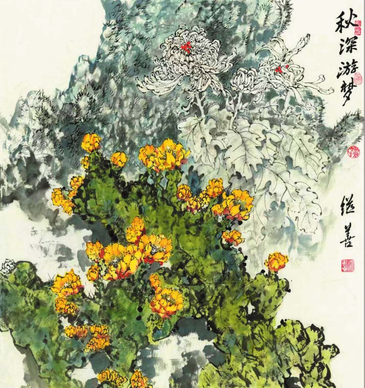 郜繼善的重彩花鳥畫偏傳統(tǒng),筆法細(xì)膩工整,色彩明麗典雅,構(gòu)圖大氣別致,情趣盎然,意境深遠(yuǎn)。作品中各種元素有機(jī)融合,自然穿插,形成和諧有序的布局,讓人既能感受到自然界的豐富與絢爛,又可體味藝術(shù)帶來的愉悅和感動。在他的筆下,重彩成為了最具藝術(shù)感染力的手段,也是最有個(gè)性藝術(shù)特征的語言,鮮明、強(qiáng)烈,可謂“脫盡媚俗寫重彩”。