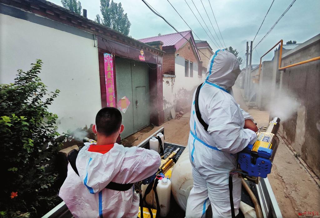河北涿州發(fā)生暴雨洪澇災(zāi)害后,我市天龍救援隊響應(yīng)號召,攜帶專業(yè)救援設(shè)備迅速奔赴當(dāng)?shù)鼐仍?,大家沖鋒在前,積極投入抽水、排污、清淤、搬運物資、消殺等工作中。圖為8月7日在該市刁窩鎮(zhèn),民盟盟員、救援隊隊員王宇龍(右一)和隊友在進(jìn)行街巷消殺。(焦未軍攝)