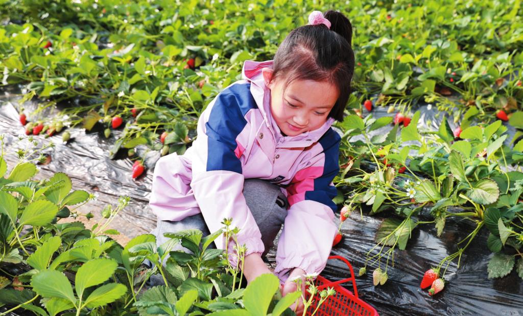 1月18日,小朋友在忻府區(qū)欣欣生態(tài)園果蔬大棚采摘草莓。近年來,忻府區(qū)不斷探索市場需求,調(diào)整種植結(jié)構(gòu),因地制宜發(fā)展大棚種植,既豐富了群眾的“菜籃子”“果盤子”,也拓寬了農(nóng)民的增收渠道。 (張存良 攝