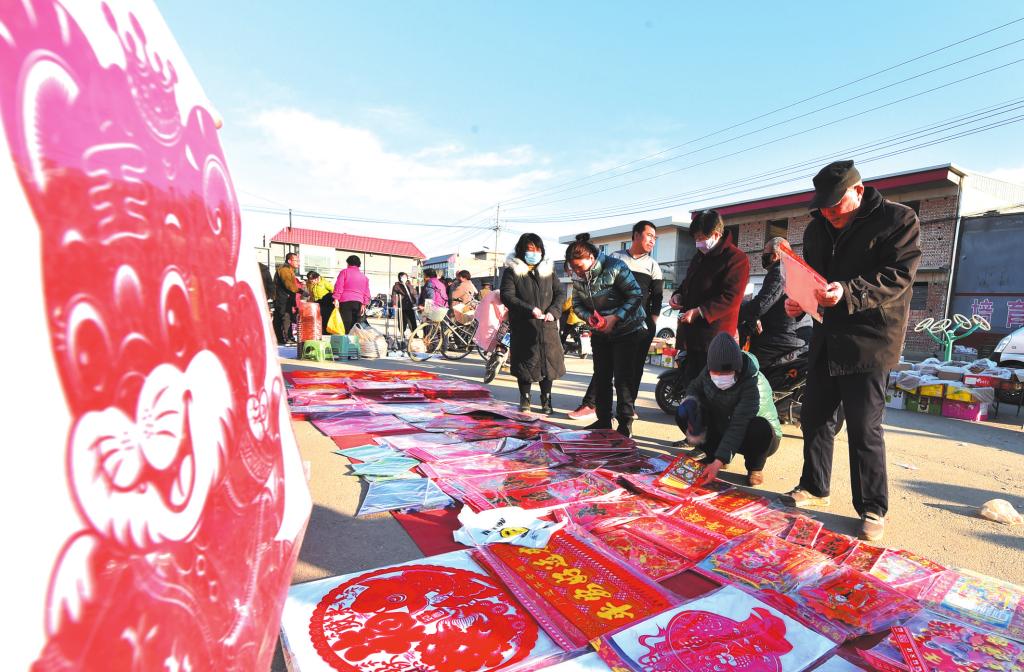 忻府區(qū)東樓鄉(xiāng)南肖村廣場村民挑選春聯(lián)、購買年貨