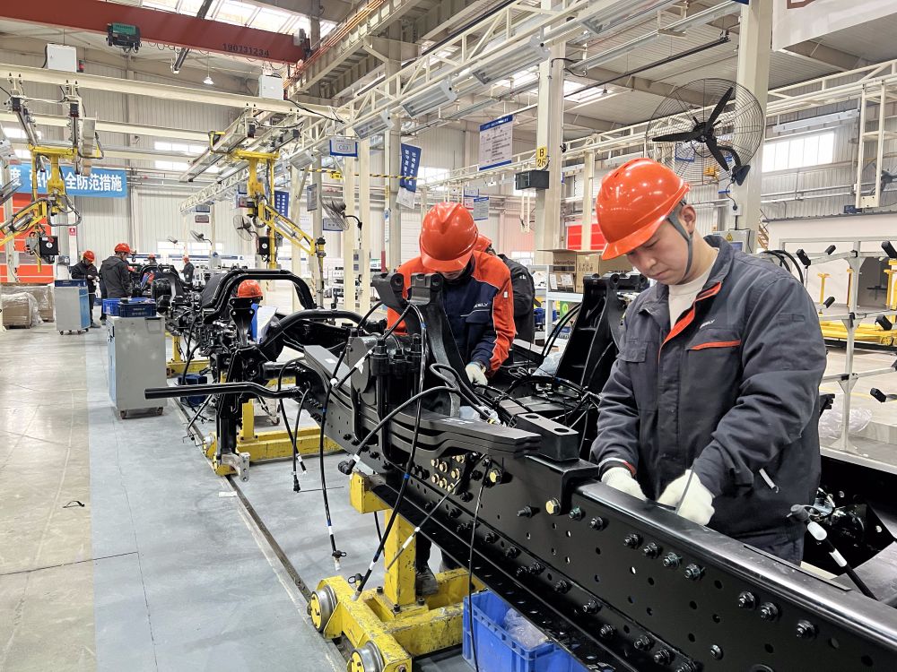 甲醇重卡總裝車間內(nèi)工人們正在進(jìn)行組裝工作。(新華社記者 張磊 攝)