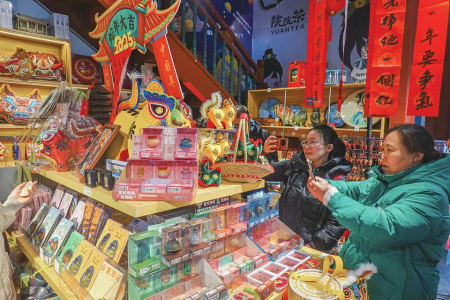 ⑤2月2日,太原鐘樓書(shū)院,游客正在拍照記錄具有濃郁地方特色的精美文創(chuàng)產(chǎn)品。