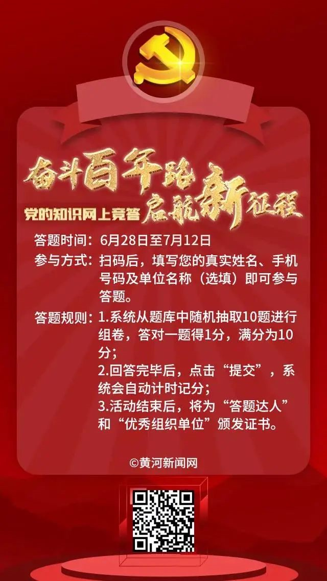 學(xué)習(xí)百年黨史,傳承紅色基因,汲取奮進(jìn)力量。為慶祝中國(guó)共產(chǎn)黨成立100周年,重溫黨的光輝歷程與偉大成就,扎實(shí)推動(dòng)黨史學(xué)習(xí)教育走深走實(shí),由山西省委網(wǎng)信辦指導(dǎo)、黃河新聞網(wǎng)承辦的【奮斗百年路 啟航新征程】黨的知識(shí)網(wǎng)上競(jìng)答正式上線,邀您參與!