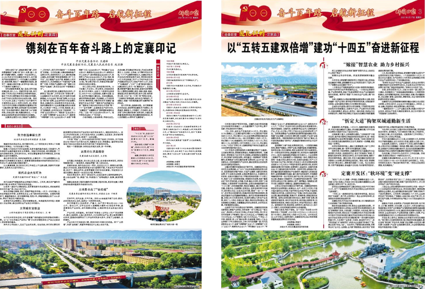 鱗次櫛比的定襄縣晉昌大街建筑 安民大慮曰“定”,辟地有德曰“襄”,歷史的厚重鍛造了定襄人民“崇文、尚勇、重義、創(chuàng)新”的智慧與精神。定襄是一片紅色的熱土,從1926年成立中共定襄縣支部至今,在中國(guó)共產(chǎn)黨的堅(jiān)強(qiáng)領(lǐng)導(dǎo)下,一代代定襄兒女謳歌奮進(jìn)、砥礪拼搏,描繪了一幅幅精彩的畫(huà)卷,譜寫(xiě)了一篇篇壯美的華章,在百年奮斗路上留下了最美的“定襄印記”。 百年成就碩果累累,催人奮進(jìn);百年實(shí)踐波瀾壯闊,深入人心。回望百年奮斗路,我們戰(zhàn)勝了許多以往從未遇到過(guò)的困難和挑戰(zhàn),解決了許多長(zhǎng)期想解決而沒(méi)有解決的難題,辦成了許多過(guò)去想辦而未辦成的大事。黨的十八大以來(lái),全縣上下堅(jiān)持以習(xí)近平新時(shí)代中國(guó)特色社會(huì)主義思想為指導(dǎo),深入貫徹習(xí)近平總書(shū)記視察山西重要講話(huà)重要指示和“三篇光輝文獻(xiàn)”精神,按照省委“四為四高兩同步”總體思路和要求,圍繞市委“336”戰(zhàn)略布局,決勝全面小康,構(gòu)建創(chuàng)新生態(tài),一個(gè)宜居宜業(yè)宜游宜養(yǎng)宜創(chuàng)的田園城市正在崛起。 定襄是全國(guó)四大法蘭鍛造產(chǎn)業(yè)集群之一,歷史悠久,明萬(wàn)歷年間就有“一斗芝麻鐵匠”的美譽(yù)。今日的定襄,以建設(shè)高端制造產(chǎn)業(yè)群為方向,因勢(shì)利導(dǎo)關(guān)小上大,梯次推進(jìn)整合重組,成功創(chuàng)建了具有里程碑意義的“十大平臺(tái)”,法蘭鍛造產(chǎn)業(yè)總產(chǎn)值、銷(xiāo)售收入雙雙突破百億元,先后被確定為“中國(guó)百佳產(chǎn)業(yè)集群”“中國(guó)·中西部產(chǎn)業(yè)集群50強(qiáng)”“國(guó)家火炬特色產(chǎn)業(yè)基地”,是實(shí)至名歸的“中國(guó)鍛造之鄉(xiāng)”。 進(jìn)入新發(fā)展階段,定襄堅(jiān)持試點(diǎn)先行,不斷使出“組合拳”,為市場(chǎng)主體“舒筋壯骨”。以金融服務(wù)平臺(tái)為依托,致力打造資本創(chuàng)新新高地,35戶(hù)企業(yè)在“晉興板”掛牌,28戶(hù)企業(yè)在“展示板”掛牌,企業(yè)進(jìn)軍資本市場(chǎng)呈梯隊(duì)推進(jìn),定襄成功入選省級(jí)資本市場(chǎng)試點(diǎn)縣。搶抓創(chuàng)建省級(jí)中小企業(yè)高質(zhì)量發(fā)展試點(diǎn)縣契機(jī),大力推進(jìn)“個(gè)轉(zhuǎn)企、小升規(guī)、規(guī)改股、股上市”倍增提質(zhì),各類(lèi)市場(chǎng)主體“風(fēng)起泉涌”,“小升規(guī)”企業(yè)達(dá)到80戶(hù)、“規(guī)改股”企業(yè)達(dá)到12戶(hù)、省級(jí)“專(zhuān)精特新”企業(yè)達(dá)到23戶(hù)、國(guó)家級(jí)“專(zhuān)精特新”小巨人企業(yè)達(dá)到4戶(hù)、省級(jí)“專(zhuān)精特新”小巨人企業(yè)達(dá)到6戶(hù)、“兩化融合”企業(yè)達(dá)到8戶(hù)、高新技術(shù)企業(yè)達(dá)到12戶(hù)、省級(jí)技術(shù)中心達(dá)到8戶(hù)、股份制改造企業(yè)達(dá)到43戶(hù),取得軍工產(chǎn)品認(rèn)證企業(yè)達(dá)到6戶(hù),天寶、恒躍、管家營(yíng)集團(tuán)3戶(hù)企業(yè)進(jìn)入全省民營(yíng)企業(yè)制造業(yè)100強(qiáng)?!案伊⒊鳖^唱大風(fēng)、民營(yíng)經(jīng)濟(jì)看定襄”的標(biāo)桿態(tài)勢(shì)充分彰顯。 初心力把山河變,使命勁催分秒爭(zhēng)。22萬(wàn)定襄人不忘初心、牢記使命,決勝脫貧攻堅(jiān),助力鄉(xiāng)村振興,全縣57個(gè)貧困村全部退出,3889戶(hù)7463人全部脫貧,定襄與全國(guó)、全省、全市同步建成小康社會(huì)。走進(jìn)定襄盆地,滹沱河兩岸生機(jī)盎然、風(fēng)光錦繡,10萬(wàn)農(nóng)民櫛風(fēng)沐雨、精神昂揚(yáng),用勤勞的雙手支撐起“國(guó)家現(xiàn)代農(nóng)業(yè)示范區(qū)”“國(guó)家農(nóng)產(chǎn)品質(zhì)量安全縣”“國(guó)家電子商務(wù)進(jìn)農(nóng)村綜合示范縣”等一個(gè)個(gè)“金字招牌”,全縣糧食生產(chǎn)連年豐收,“定襄甜瓜”“定襄糯玉米”榮獲國(guó)家地理標(biāo)志產(chǎn)品,“三品一標(biāo)”認(rèn)證達(dá)到48類(lèi)204個(gè)?,F(xiàn)代特色農(nóng)業(yè)駛?cè)肓恕翱燔?chē)道”。 小城市崛起、大縣城格局、同城化定位。走進(jìn)定襄,項(xiàng)目建設(shè)風(fēng)帆正勁,開(kāi)發(fā)區(qū)發(fā)展蒸蒸日上,主戰(zhàn)場(chǎng)、主陣地、主引擎作用充分顯現(xiàn),“5+5”產(chǎn)業(yè)集群持續(xù)壯大,定襄經(jīng)濟(jì)技術(shù)開(kāi)發(fā)區(qū)成功晉級(jí)省級(jí)開(kāi)發(fā)區(qū),特別是總投資13億元的寶航重工年產(chǎn)10萬(wàn)噸風(fēng)電法蘭生產(chǎn)線(xiàn)建設(shè)項(xiàng)目從開(kāi)工到投產(chǎn)用時(shí)310天,創(chuàng)造了“定襄速度”?!叭龑?duì)”“六最”營(yíng)商環(huán)境成為定襄發(fā)展史上的又一張“靚麗名片”。走進(jìn)定襄,頓感朝氣蓬勃、魅力四射,縣域內(nèi)自然景觀和人文景觀交相輝映,航空、高鐵、鐵路、高速、國(guó)省道立體交通布網(wǎng)全域,城中公園、城郊森林公園、文化廣場(chǎng)、“六館一院”等亮點(diǎn)紛呈,“三城聯(lián)創(chuàng)”相得益彰,城市品位不斷提升,產(chǎn)城融合、城鎮(zhèn)一體的高質(zhì)量發(fā)展“定襄樣板”悄然形成。 奮斗百年路,啟航新征程。我們將踏著歷史的足跡,團(tuán)結(