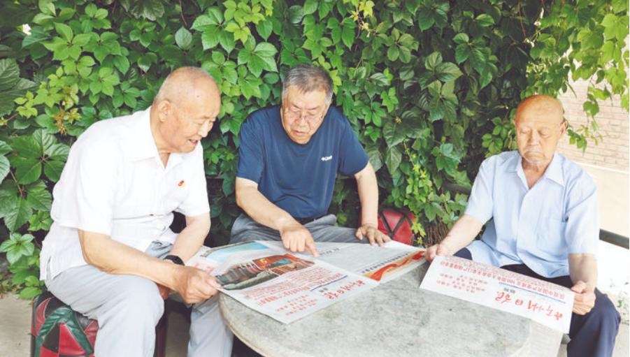 7月5日,在原市廣播局家屬院,老黨員們正在學(xué)習(xí)習(xí)近平總書(shū)記“七一”重要講話。(張存良 攝)