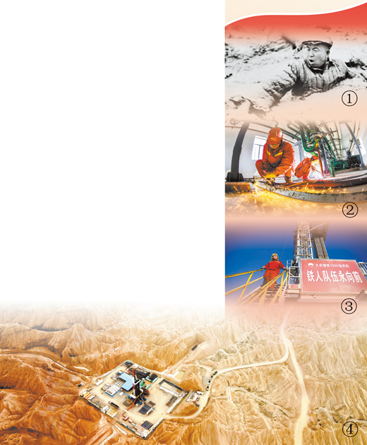 圖①:石油大會戰(zhàn)中,王進喜忍著堿性泥漿帶來的灼痛,用血肉之軀奮力攪拌泥漿。資料圖片