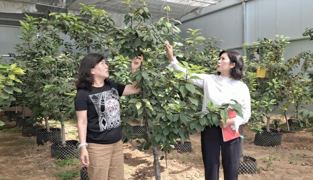 新路村黨支部書記、村委會主任劉翠萍與“櫻桃樹下”種植園有關負責人察看櫻桃長勢。張林泉 攝