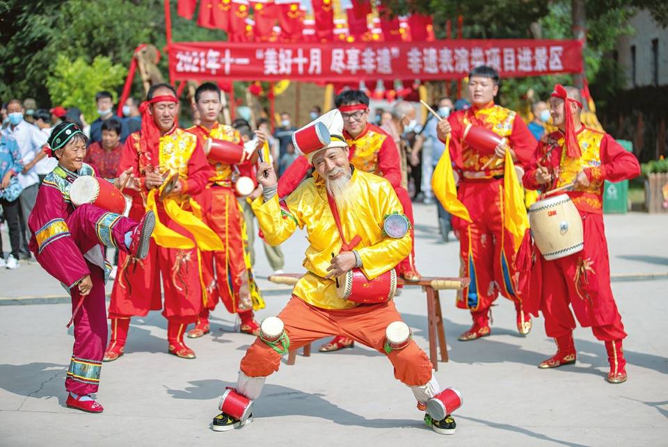 10月2日,民間藝人在鹽湖區(qū)東郭鎮(zhèn)嵐山根景區(qū)表演國家級(jí)非遺“萬榮花鼓”。國慶長假期間,運(yùn)城市鹽湖區(qū)東郭鎮(zhèn)嵐山根景區(qū)在做好疫情防控的同時(shí),推出“非遺進(jìn)景區(qū)”、蒲劇展演等豐富多彩的民俗活動(dòng),吸引了眾多游客前來游玩。(閆鑫攝)