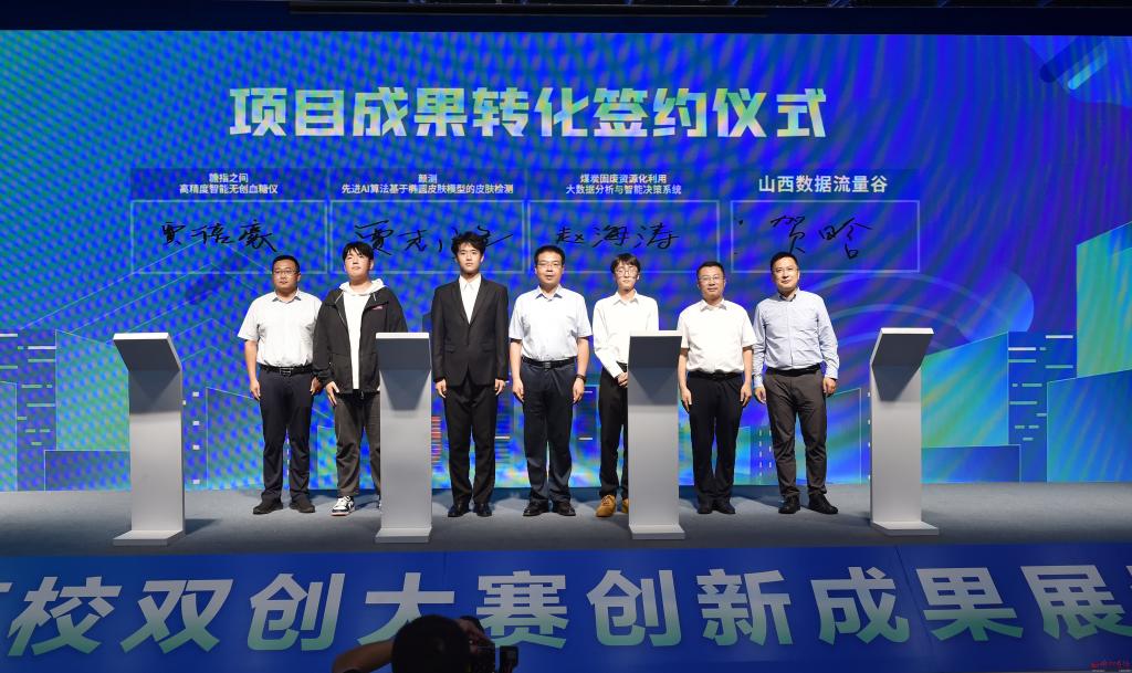 項(xiàng)目成果轉(zhuǎn)化簽約儀式現(xiàn)場(chǎng)。馮曉磊 攝 9月16日,首屆數(shù)字經(jīng)濟(jì)高校雙創(chuàng)大賽創(chuàng)新成果展示暨頒獎(jiǎng)典禮在忻州舉辦。省委書記藍(lán)佛安致賀信,教育部副部長(zhǎng)、黨組成員孫堯發(fā)表視頻致辭,省委常委、統(tǒng)戰(zhàn)部部長(zhǎng)徐廣國(guó)出席活動(dòng)。省委統(tǒng)戰(zhàn)部副部長(zhǎng)、省工商聯(lián)黨組書記陳旭忠,省教育廳黨組書記、廳長(zhǎng)馬駿,省工商聯(lián)主席景普秋,省科協(xié)黨組書記、副主席丁紀(jì)崗,市委書記朱曉東,市委副書記、市長(zhǎng)李建國(guó),省委統(tǒng)戰(zhàn)部副部長(zhǎng)郭延斌,省工信廳副廳長(zhǎng)尚阿浪,團(tuán)省委副書記陳鍇,省工商聯(lián)副主席李劍英,副市長(zhǎng)、太忻經(jīng)濟(jì)一體化發(fā)展忻州區(qū)運(yùn)營(yíng)中心黨委書記、主任王建峰出席活動(dòng)。 藍(lán)佛安在賀信中指出,當(dāng)今時(shí)代,數(shù)字浪潮正以迅速崛起、深度滲透的姿態(tài)席卷而來(lái),成為影響全球格局、重塑競(jìng)爭(zhēng)秩序、加速時(shí)代變革的重要力量。近年來(lái),山西深入學(xué)習(xí)貫徹習(xí)近平總書記關(guān)于發(fā)展數(shù)字經(jīng)濟(jì)的重要論述,認(rèn)真貫徹落實(shí)黨的二十大關(guān)于“加快建設(shè)網(wǎng)絡(luò)強(qiáng)國(guó)、數(shù)字中國(guó)”的重大部署,大力推動(dòng)產(chǎn)業(yè)數(shù)字化和數(shù)字產(chǎn)業(yè)化,全省數(shù)字經(jīng)濟(jì)跑出加速度、邁上新臺(tái)階。省委十二屆六次全會(huì)明確將推動(dòng)數(shù)字經(jīng)濟(jì)發(fā)展壯大作為六大轉(zhuǎn)型行動(dòng)之一,必將為山西進(jìn)一步加快轉(zhuǎn)型發(fā)展、奮進(jìn)“兩個(gè)基本實(shí)現(xiàn)”目標(biāo)注入強(qiáng)勁動(dòng)能。 藍(lán)佛安強(qiáng)調(diào),數(shù)字經(jīng)濟(jì)高質(zhì)量發(fā)展,關(guān)鍵在創(chuàng)新,根本靠人才。數(shù)字經(jīng)濟(jì)高校雙創(chuàng)大賽為大學(xué)生青年才俊擁抱數(shù)字浪潮、投身創(chuàng)業(yè)創(chuàng)新提供了新的平臺(tái),在高校、企業(yè)、資本和創(chuàng)新項(xiàng)目之間搭建了新的橋梁。希望同學(xué)們打牢知識(shí)基礎(chǔ)、勇攀科技高峰,以昂揚(yáng)向上的朝氣、敢為人先的銳氣,在探索美好未來(lái)、逐夢(mèng)數(shù)字時(shí)代的征途上大展身手,努力為實(shí)現(xiàn)中華民族偉大復(fù)興的中國(guó)夢(mèng)貢獻(xiàn)智慧和力量。同時(shí),也希望參與和支持本次大賽的省內(nèi)外各高校、企業(yè)和機(jī)構(gòu),攜起手來(lái),加強(qiáng)合作,共創(chuàng)數(shù)字山西美好未來(lái),助力數(shù)字中國(guó)建設(shè)。 孫堯在致辭中強(qiáng)調(diào),黨的二十大報(bào)告中指出“教育、科技、人才是全面建設(shè)社會(huì)主義現(xiàn)代化國(guó)家的基礎(chǔ)性、戰(zhàn)略性支撐”,山西省教育廳和省工商聯(lián)主辦的這場(chǎng)數(shù)字經(jīng)濟(jì)高校雙創(chuàng)大賽,是培養(yǎng)數(shù)字經(jīng)濟(jì)創(chuàng)新創(chuàng)業(yè)人才的有效途徑,也是推動(dòng)數(shù)字經(jīng)濟(jì)產(chǎn)教融合創(chuàng)新發(fā)展的重要平臺(tái),對(duì)促進(jìn)高校學(xué)生創(chuàng)新創(chuàng)業(yè)、推動(dòng)項(xiàng)目落地見(jiàn)效具有積極作用。希望這些年輕的創(chuàng)業(yè)者繼續(xù)保持創(chuàng)新的激情,成為民營(yíng)經(jīng)濟(jì)數(shù)字化轉(zhuǎn)型的中堅(jiān)力量。希望大賽持續(xù)舉辦,將其打造為我國(guó)數(shù)字經(jīng)濟(jì)領(lǐng)域的一個(gè)重要平臺(tái),營(yíng)造鼓勵(lì)創(chuàng)新創(chuàng)業(yè)創(chuàng)造的社會(huì)氛圍,推動(dòng)數(shù)字經(jīng)濟(jì)的蓬勃發(fā)展。 據(jù)介紹,這是全國(guó)首個(gè)圍繞數(shù)字經(jīng)濟(jì)領(lǐng)域,面向高校學(xué)子的雙創(chuàng)大賽。大賽以“輕輕聯(lián)動(dòng)·數(shù)實(shí)融合”為主題,旨在為高校、政府、企業(yè)、資本和創(chuàng)新項(xiàng)目之間建立起溝通橋梁,推動(dòng)數(shù)字經(jīng)濟(jì)領(lǐng)域人才培養(yǎng),助力山西數(shù)字經(jīng)濟(jì)高質(zhì)量發(fā)展。大賽圍繞產(chǎn)業(yè)數(shù)字化、數(shù)字產(chǎn)業(yè)化設(shè)置創(chuàng)新創(chuàng)業(yè)和新媒體雙賽道,通過(guò)打造高水平的創(chuàng)新創(chuàng)業(yè)平臺(tái),積極引導(dǎo)高校畢業(yè)生留創(chuàng)本地,助力年輕人實(shí)現(xiàn)創(chuàng)新創(chuàng)業(yè)夢(mèng)想,共同為山西數(shù)字經(jīng)濟(jì)高質(zhì)量發(fā)展“添磚加瓦”。 大賽自6月5日正式啟動(dòng)以來(lái),獲得全國(guó)60多所高校、近百家數(shù)字經(jīng)濟(jì)企業(yè)的積極響應(yīng),大賽抖音話題#這YOUNG很山西#累計(jì)播放量已突破1.1億次,線上線下累計(jì)參賽人數(shù)超10萬(wàn)人。創(chuàng)新創(chuàng)業(yè)賽道報(bào)名項(xiàng)目525組,項(xiàng)目領(lǐng)域涵蓋數(shù)字文娛、數(shù)字能源、數(shù)字農(nóng)業(yè)、數(shù)字智造、數(shù)字醫(yī)療、數(shù)字教育、數(shù)字生活、數(shù)字基建等多個(gè)方面,最終甄選出12組數(shù)字經(jīng)濟(jì)領(lǐng)域具有引領(lǐng)性和廣闊發(fā)展前景的科技創(chuàng)新成果,培育出一批實(shí)用型數(shù)字經(jīng)濟
