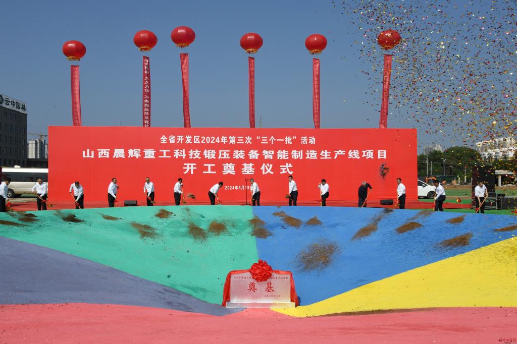 奠基儀式現(xiàn)場(chǎng)。劉紀(jì)森 攝 8月19日,全省開(kāi)發(fā)區(qū)2024年第三次項(xiàng)目集中簽約一批、開(kāi)工一批、投產(chǎn)一批“三個(gè)一批”活動(dòng)舉行,我市在忻州經(jīng)濟(jì)開(kāi)發(fā)區(qū)設(shè)立分會(huì)場(chǎng),與全省同步舉行相關(guān)活動(dòng)。市委書(shū)記朱曉東在我市分會(huì)場(chǎng)出席并匯報(bào)我市開(kāi)發(fā)區(qū)“三個(gè)一批”項(xiàng)目情況。市委副書(shū)記、市長(zhǎng)李建國(guó)在省主會(huì)場(chǎng)出席。省優(yōu)化營(yíng)商環(huán)境和開(kāi)發(fā)區(qū)重點(diǎn)工作服務(wù)一組成員,市領(lǐng)導(dǎo)溫建軍、王建峰、孟宏斌,市政府秘書(shū)長(zhǎng)張艮生,市直相關(guān)部門(mén)、各縣(市、區(qū))政府主要負(fù)責(zé)同志,各開(kāi)發(fā)區(qū)(示范區(qū)、集聚區(qū))負(fù)責(zé)人及簽約和投產(chǎn)項(xiàng)目代表等參加。 朱曉東在匯報(bào)時(shí)指出,今年以來(lái),我市按照省委、省政府部署要求,牢固樹(shù)立大抓發(fā)展、大抓招商、大抓項(xiàng)目的鮮明導(dǎo)向,充分發(fā)揮開(kāi)發(fā)區(qū)主戰(zhàn)場(chǎng)主引擎作用,不斷為經(jīng)濟(jì)高質(zhì)量發(fā)展積勢(shì)蓄力。一是在項(xiàng)目謀劃儲(chǔ)備上再提升。聚焦新材料、新能源、農(nóng)產(chǎn)品加工、文旅等產(chǎn)業(yè),抓緊謀劃重大轉(zhuǎn)型項(xiàng)目,科學(xué)布局強(qiáng)鏈補(bǔ)鏈延鏈項(xiàng)目,編印《忻州市開(kāi)發(fā)區(qū)招商引資儲(chǔ)備項(xiàng)目?jī)?cè)》,積極洽談推進(jìn)有關(guān)項(xiàng)目,加快項(xiàng)目簽約落地。二是在加大項(xiàng)目招引上再發(fā)力。用足用好鏈?zhǔn)剿季S,依托“一道新能源”等鏈主企業(yè),積極對(duì)接國(guó)內(nèi)龍頭企業(yè),引進(jìn)了一系列重大項(xiàng)目。三是在項(xiàng)目建設(shè)推進(jìn)上再突破。統(tǒng)籌考慮要素保障、營(yíng)商環(huán)境、整體效益等,持續(xù)優(yōu)化營(yíng)商環(huán)境,培育新的有效增長(zhǎng)點(diǎn)。下一步,忻州將認(rèn)真落實(shí)本次“三個(gè)一批”活動(dòng)精神,切實(shí)把開(kāi)發(fā)區(qū)建設(shè)成效體現(xiàn)在項(xiàng)目建設(shè)、招商引資、營(yíng)商環(huán)境的提質(zhì)提速上,推動(dòng)全市經(jīng)濟(jì)社會(huì)高質(zhì)量發(fā)展。