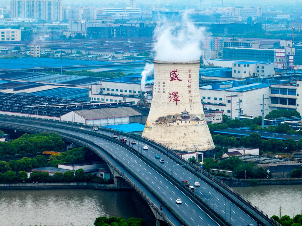 “沒想到一個小鎮(zhèn)就有‘三環(huán)’,早晚高峰還堵車。喲!這里還是‘中國絲綢第一鎮(zhèn)’?!备S記者一路調研的司機師傅說道。順著師傅的示意向窗外眺望,右前方高聳的白色冷卻塔,漸行漸近。塔上“盛澤”二字以及水鄉(xiāng)場景彩繪畫,讓這高55米、底部直徑約48米的冷卻塔,看起來像是一處“文化地標”。