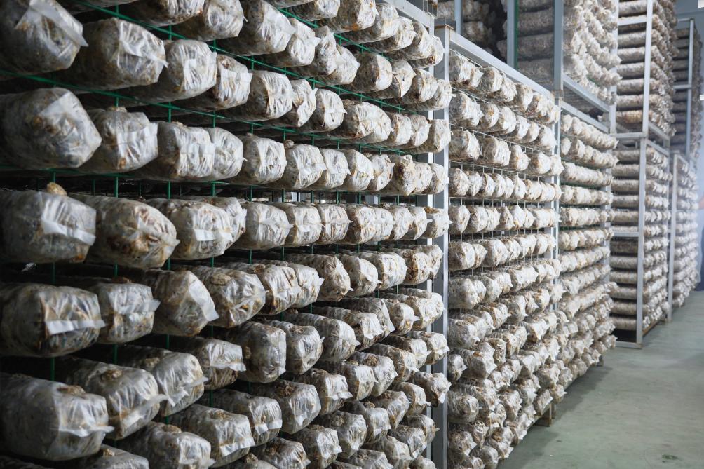 9月6日,德祥實(shí)業(yè)有限公司生產(chǎn)加工基地內(nèi),菌棒被培育在恒溫培養(yǎng)室。新華社記者 趙鑫虎 攝