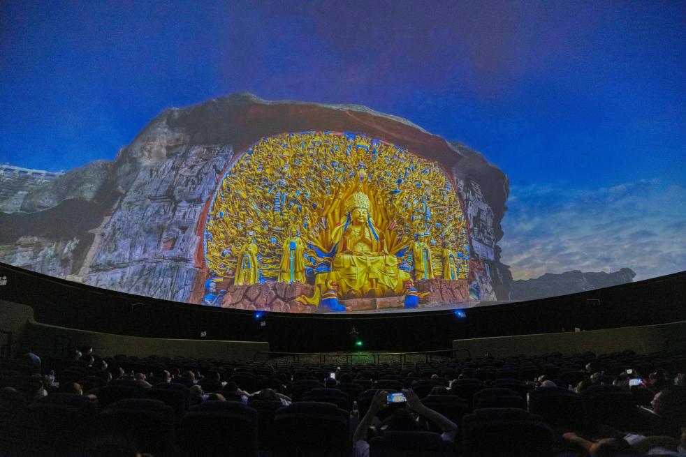 觀眾在大足石刻游客中心觀看球幕電影。(大足石刻研究院供圖) 今年1月,大足石刻數(shù)字博物館上線,首次實現(xiàn)了大足石刻數(shù)字化“云游”,參觀者可在線上全景觀賞大足石刻的眾多精美造像,甚至比在現(xiàn)場看離得更近,看到更多細節(jié)。今年4月,大足石刻數(shù)字文旅體驗上線試運行,以跨越時空、高度沉浸的體驗方式,讓歷史與現(xiàn)實有機互動。