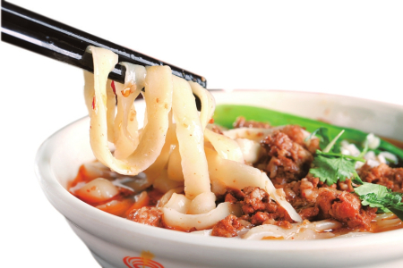 在開始削面之前,非常重要的步驟就是和面和醒面。和面的面和水需要按照一定的比例,同時(shí)對(duì)水溫也有一定的要求,冬天要用熱水,夏天要用涼水,春秋要用溫水。和好面之后緊接著就是醒面,需要用濕布蓋住面團(tuán)醒20分鐘左右。如果說吃刀削面是飽了口福,那么看刀削面下鍋可稱之為飽了眼福。一只手托著放著面團(tuán)的案板,另一只手拿著削面刀,削面刀又分為片刀和勾刀,削面時(shí),出力要平,用力要均,削出的面條中間厚兩邊薄,一葉連著一葉,在空中劃出一道道弧形白線,落入鍋中的面條好似一條條銀魚,隨著熱水的翻滾不斷舞動(dòng)。有順口溜贊曰:“一葉落鍋一葉飄,一葉離面又出刀,銀魚落水翻白浪,柳葉乘風(fēng)下樹梢。”