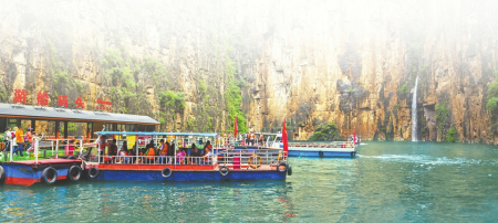 伴隨著他的講解,穿過800米的“時(shí)空隧道”,八泉峽山清水秀的核心地帶就躍然眼前了。3000米長的游船觀光水路時(shí)寬時(shí)窄,順流而下,游船上靜聽水流鳥鳴,看水中游魚穿梭而過,高峽平湖間,隨手一拍即是如畫美景,或碧波蕩漾,或山崖高聳,平靜的湖面與對(duì)峙的高山形成鮮明對(duì)比,不負(fù)“抬頭張家界,低頭九寨溝”之美名。