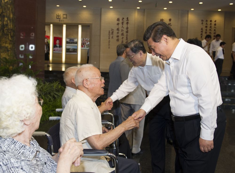 2014年7月7日,首都各界在中國(guó)人民抗日戰(zhàn)爭(zhēng)紀(jì)念館隆重集會(huì),紀(jì)念全民族抗戰(zhàn)爆發(fā)77周年。習(xí)近平出席紀(jì)念儀式并發(fā)表重要講話。這是參觀結(jié)束后,習(xí)近平等親切看望參加儀式的抗戰(zhàn)老戰(zhàn)士和老同志代表。